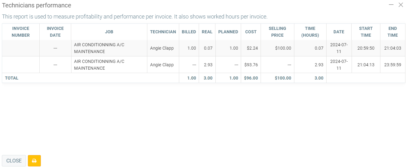 You can print the report by clicking on the yellow printer icon in the left corner of the screen, next to the "Close" button.