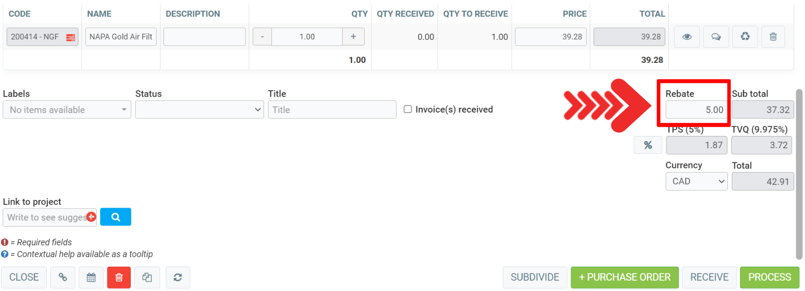 Fill in the purchase form, and at the end, next to the Sub Total, add a Rebate.