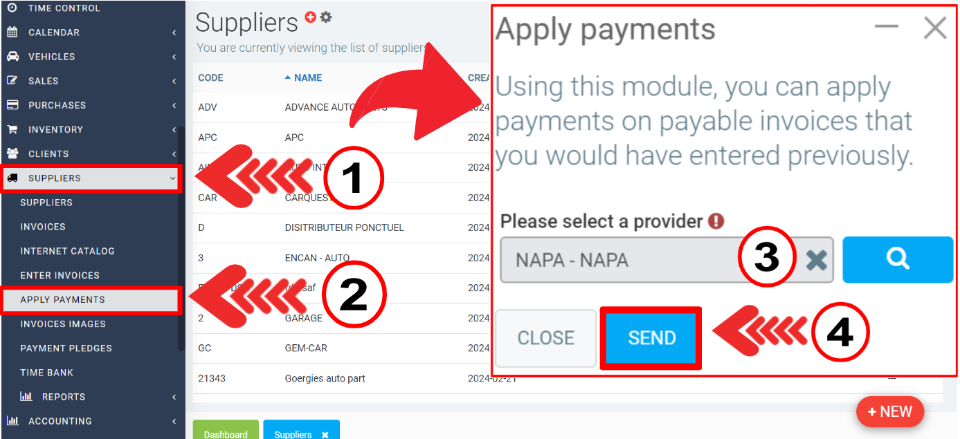 But if you want to pay all your purchase invoices in batches and add a discount, click on Suppliers > Apply payments.
