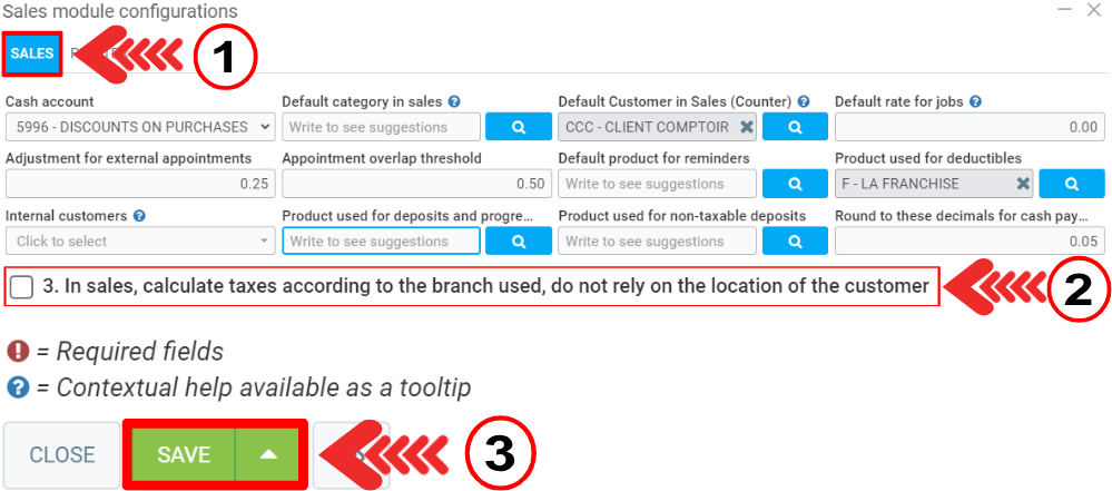 In the next window, on the Sales tab, find and check the option ''In sales, calculate taxes according to the branch used, do not rely on the location of the customer.''