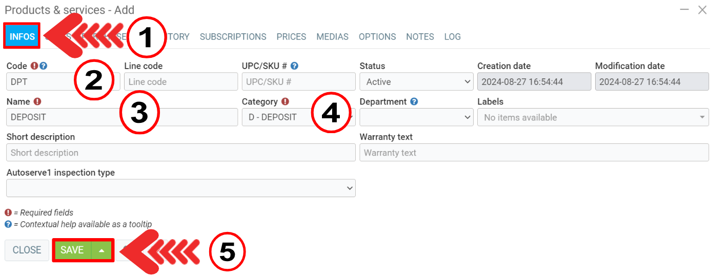 To create a deposit as a product, click on Inventory > Products and services > +New.