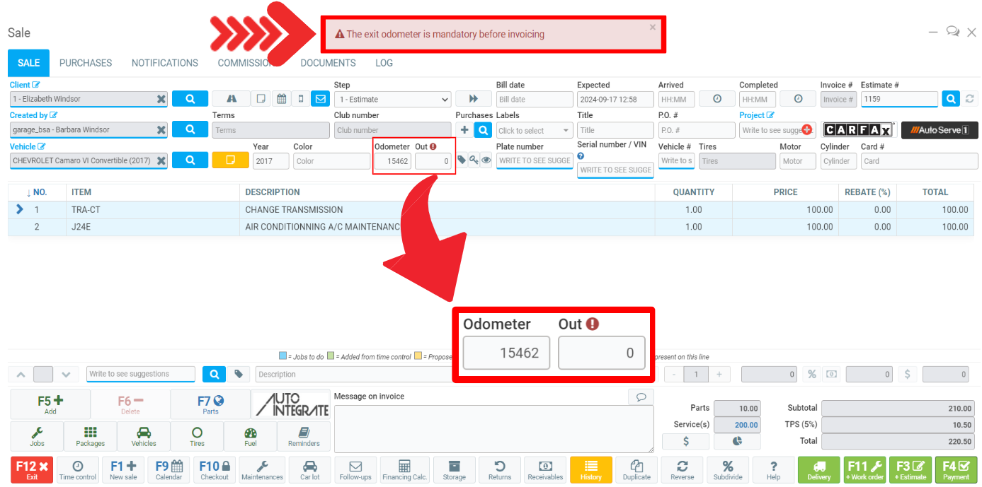 When you try to make the payment, the following message will appear in red: "The exit odometer is mandatory before invoicing".