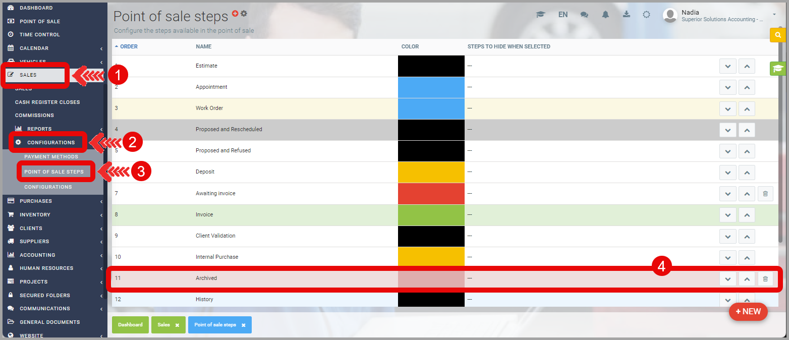 From the main menu, click on Sales > Configurations > Point of Sale Steps > Select the step Archived/ Deleted.