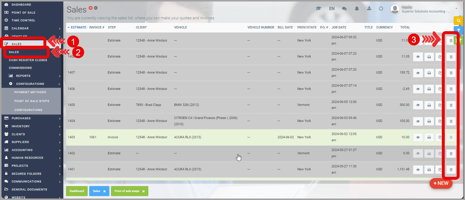 From the main menu on the left side of the application, click on Sales > Sales > Garbage Bin (bouton) next to the estimate you want to delete from the list of estimates displayed.