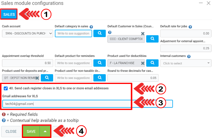 In the next window, in the Sales tab, look for the option: "Send cash register closes in XLS to one or more e-mail addresses".