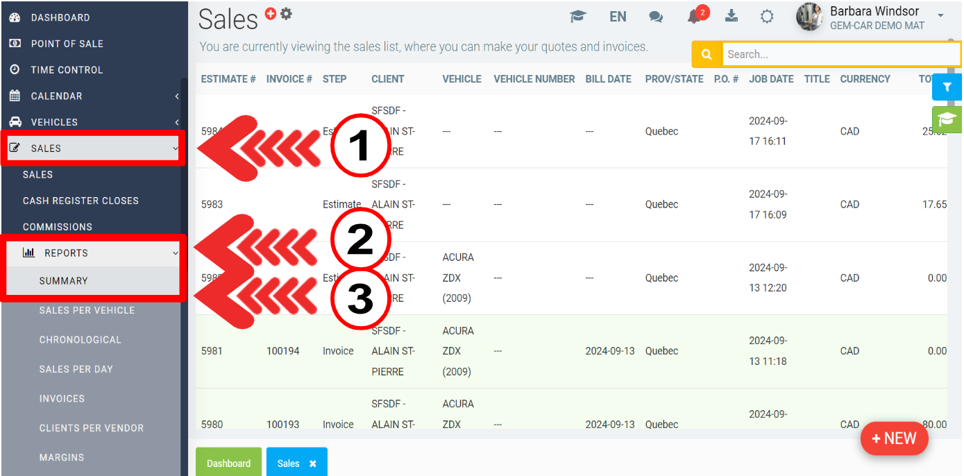To generate this report, in the GEM-WORK Main Menu, go to Sales > Reports > Summary.