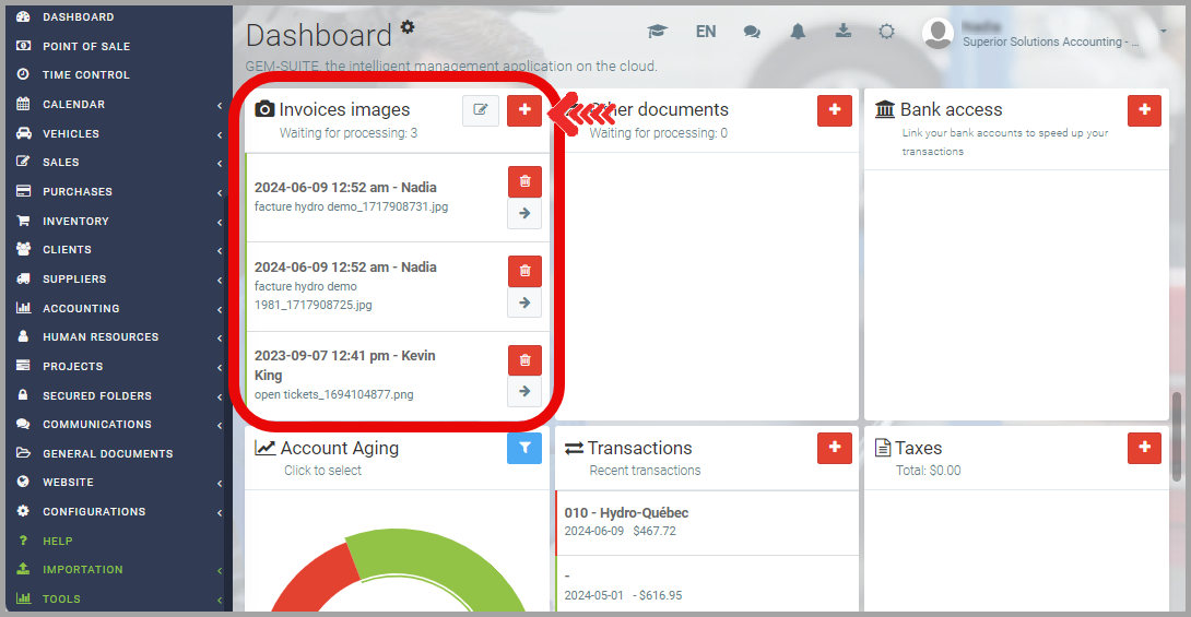 On the Dashboard (home page), find the Invoice Images module (see photo below). This box contains the photos you have taken that have not yet been processed by the accounting department. To add a new photo, click the red + button in the top right corner of the Invoice Images box.