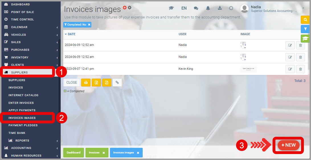 You can also access the Invoice Images module by clicking on Suppliers > Invoice Images in the left-hand menu. To add photos from this page, click the red +New button.