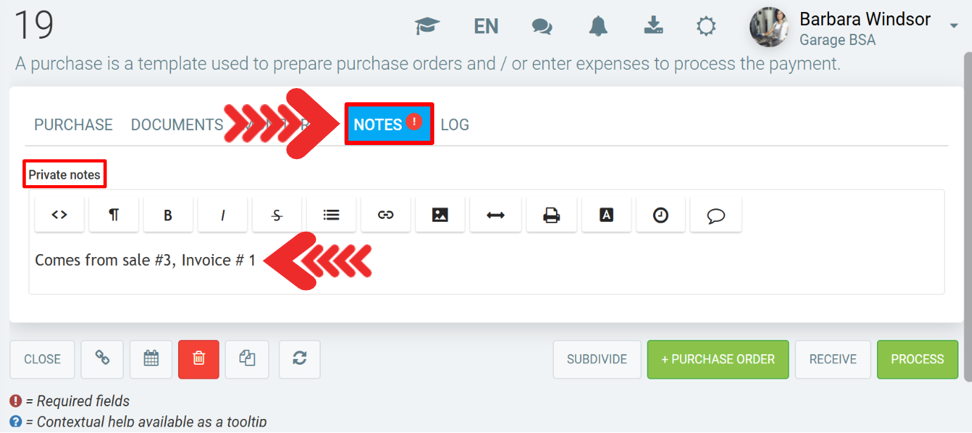 In the new purchase window, the copy displays a private note in the Notes tab.