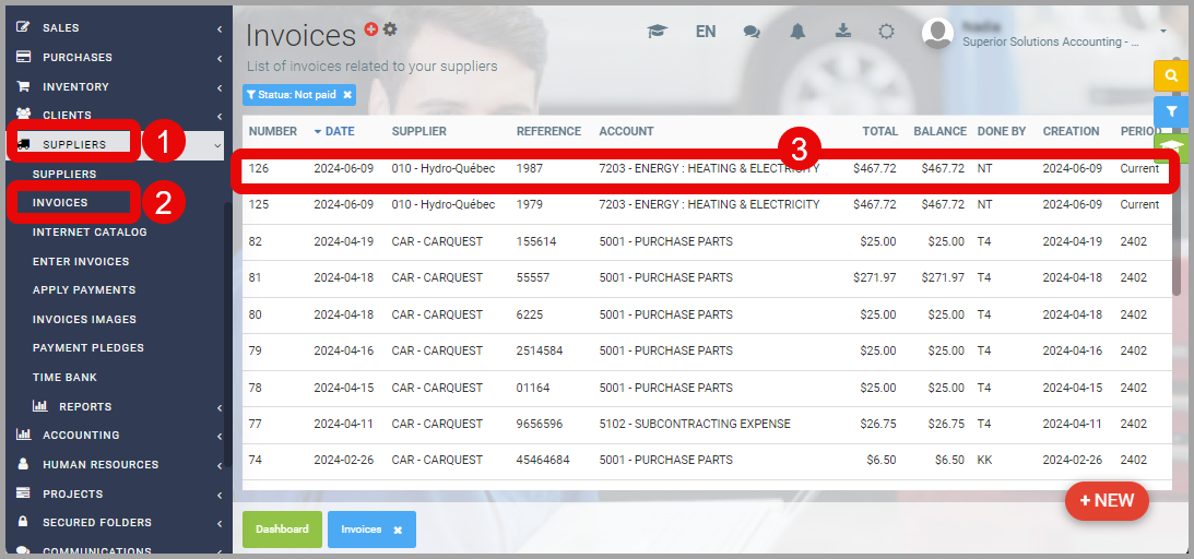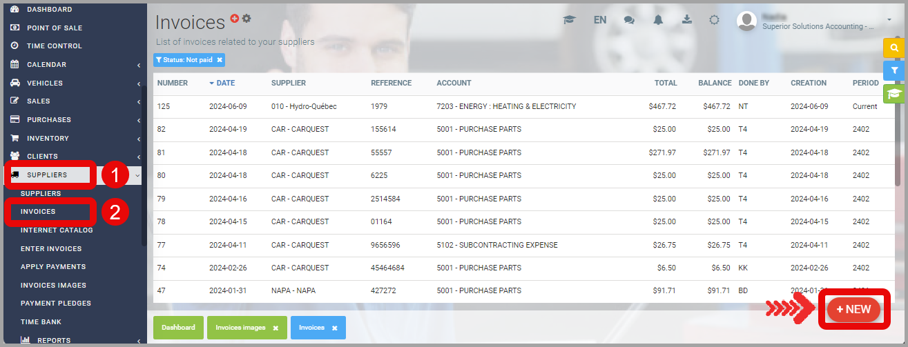 From the main menu on the left side of the application, click on Suppliers > Invoices > +New.