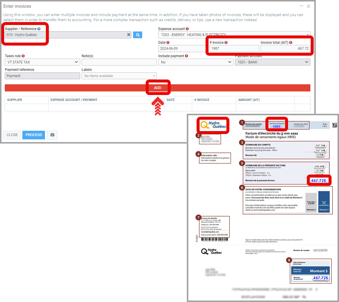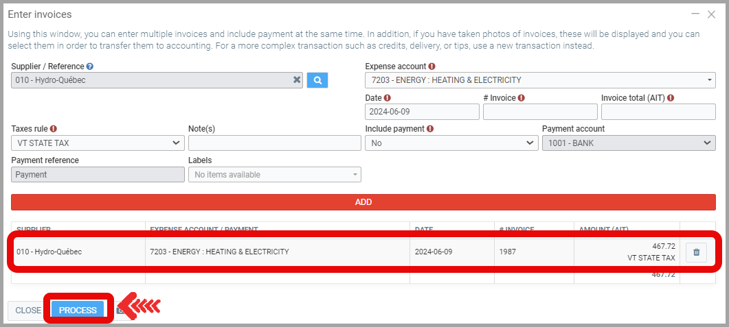 Note: You can add as many invoices as you want. However, please note that your transactions will not be saved until you click the Process button.