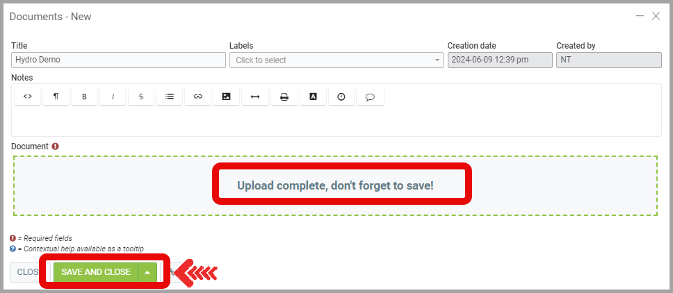 Once the document has uploaded to GEM-CAR, the window will display Upload completed, don't forget to save!.
