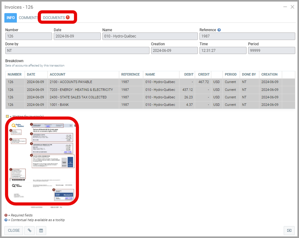 When you open the invoice again, the image of the document you uploaded will be at the bottom of the window.