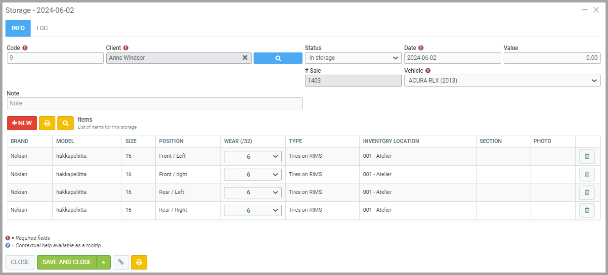 We recommend entering 4 in the quantity if the storage is for 4 tires. You can then easily modify the wear of each tire and their position when you have saved.