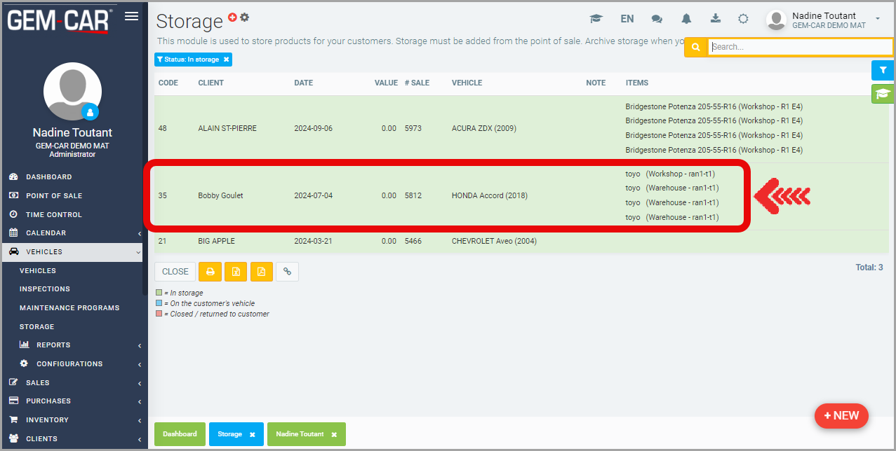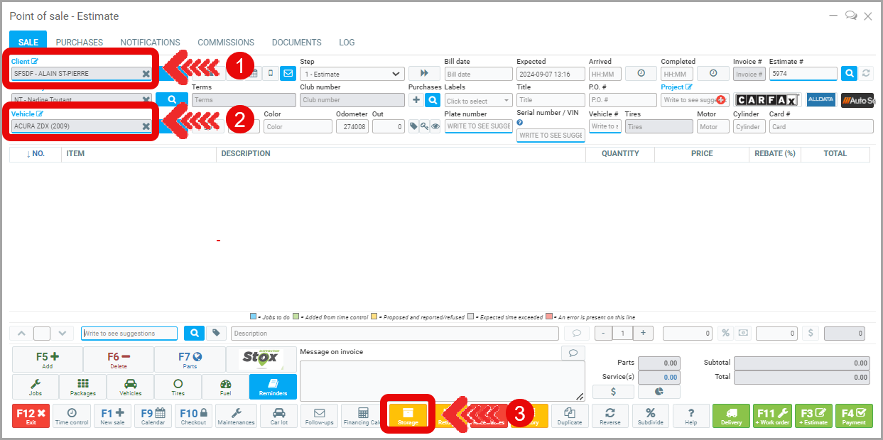 - You can find tire storage directly from the Point of Sale by entering the customer's name and the vehicle associated with the tires, then clicking on Storage in the bottom menu.