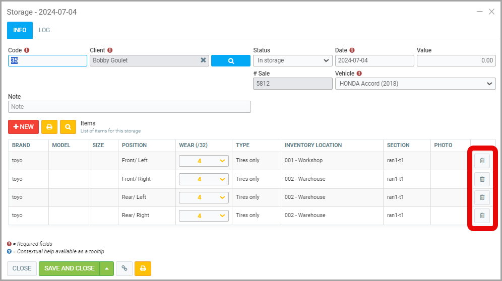 *** Also, be careful to select the correct items for which you want to deactivate the storage, as multiple storage entries for the same customer might appear in the list. - Click on the trash can icon at the end of each item you want to deactivate.