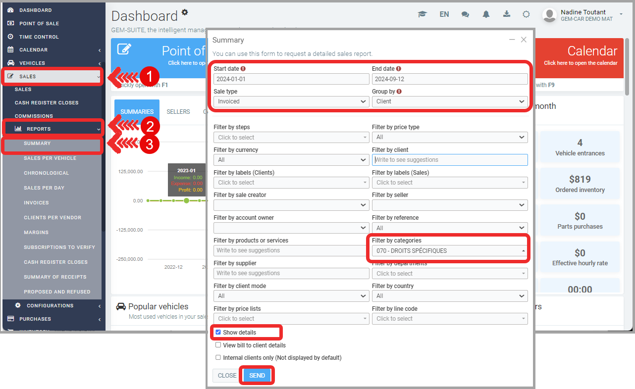 The report will indicate the date, customers, specific fees to be paid, and the grand total.