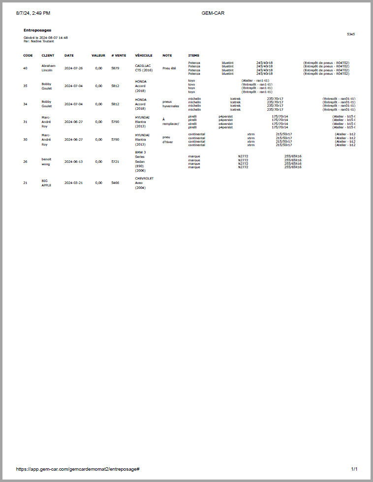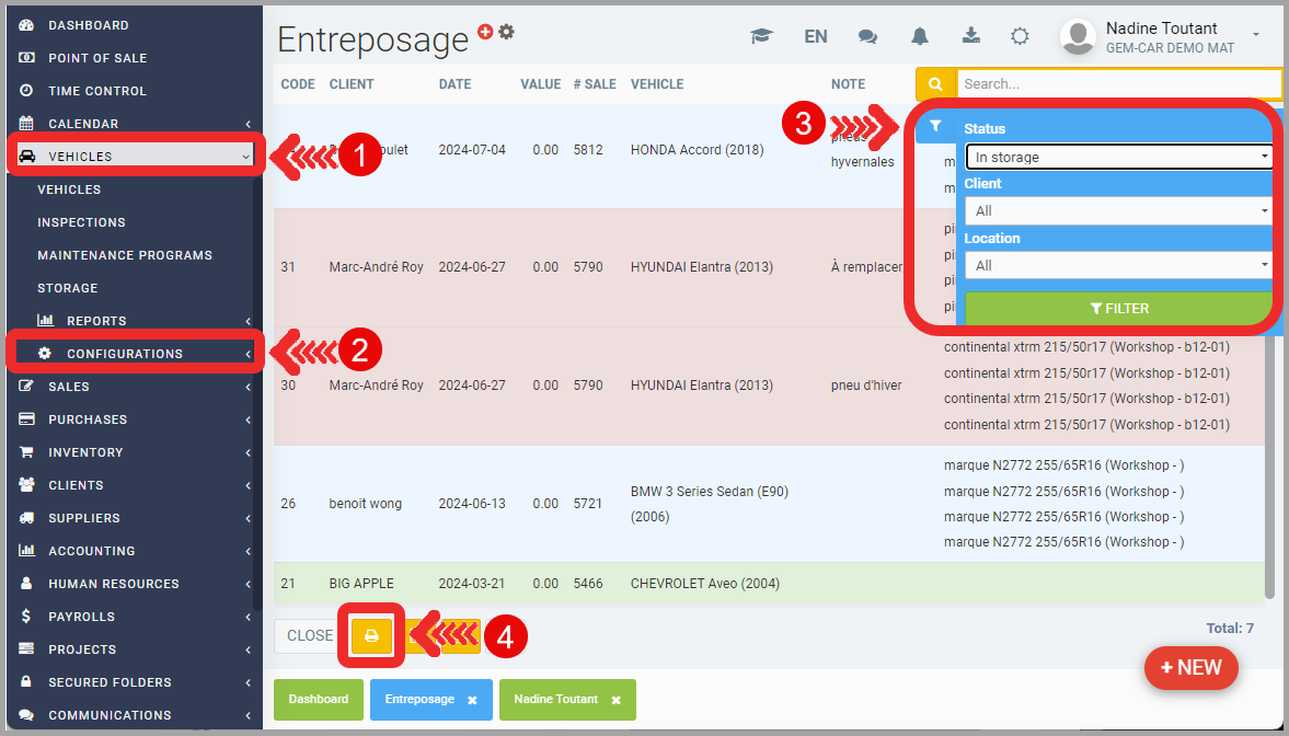 - To print the storage list, from the main menu on the left side of the application, click on Vehicles > Storage.