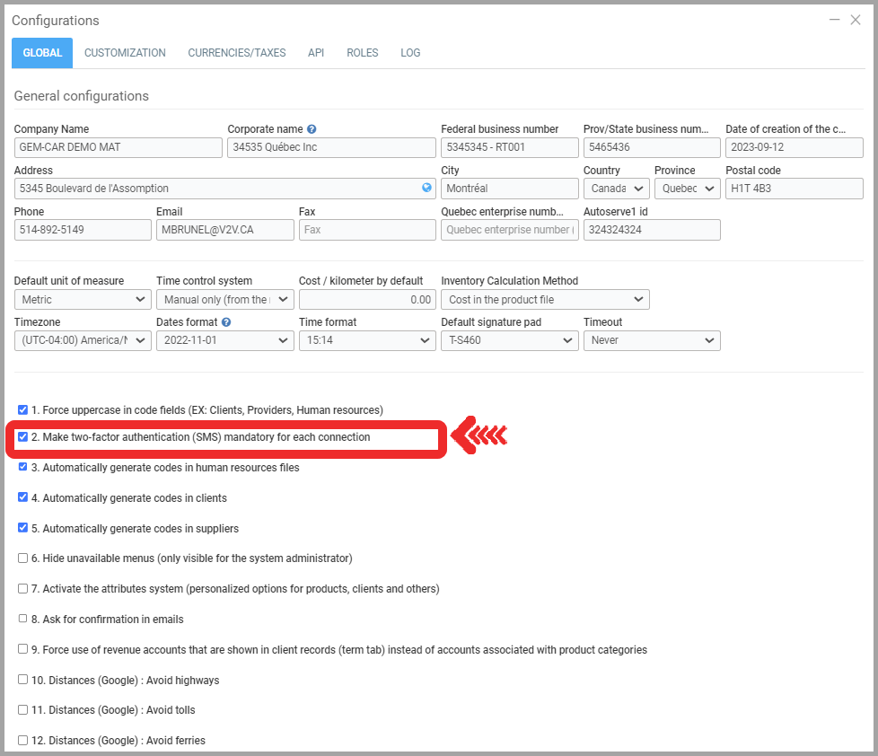 From the main menu on the left, click Configurations > Configurations > tab Global and select the option Make two-factor authentication (SMS) mandatory at each login.