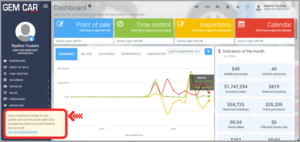 Once this option is enabled, GEM-CAR will prompt users who log in to add their mobile phone number in their human resources file.