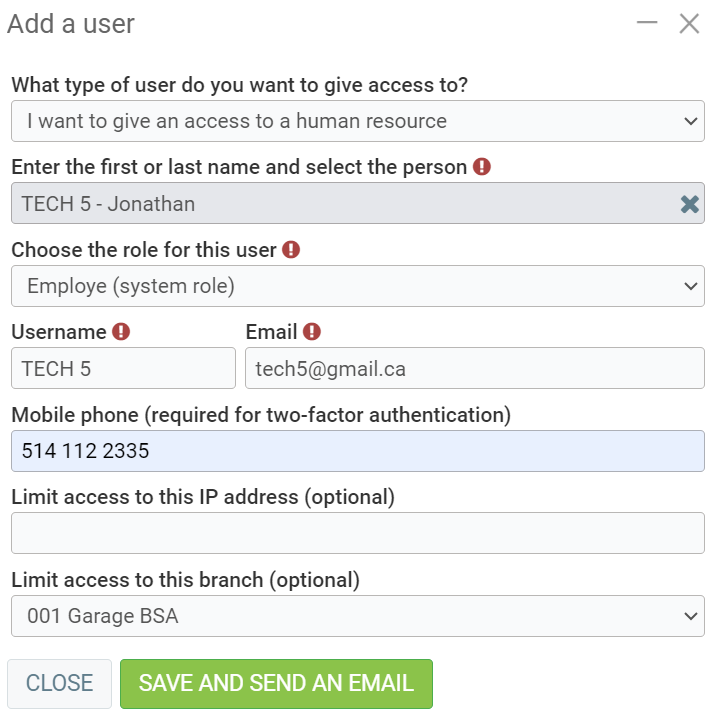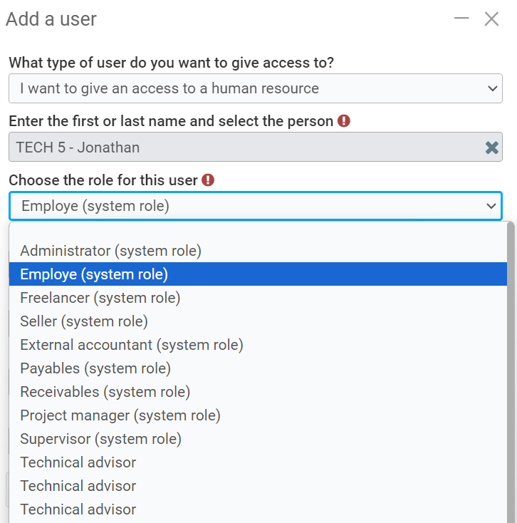 The user must have been previously created as a human resource, client, or supplier. Read the following articles for more details: