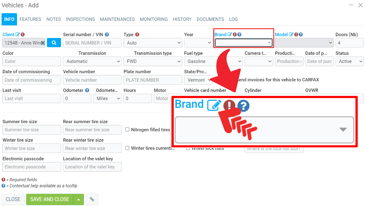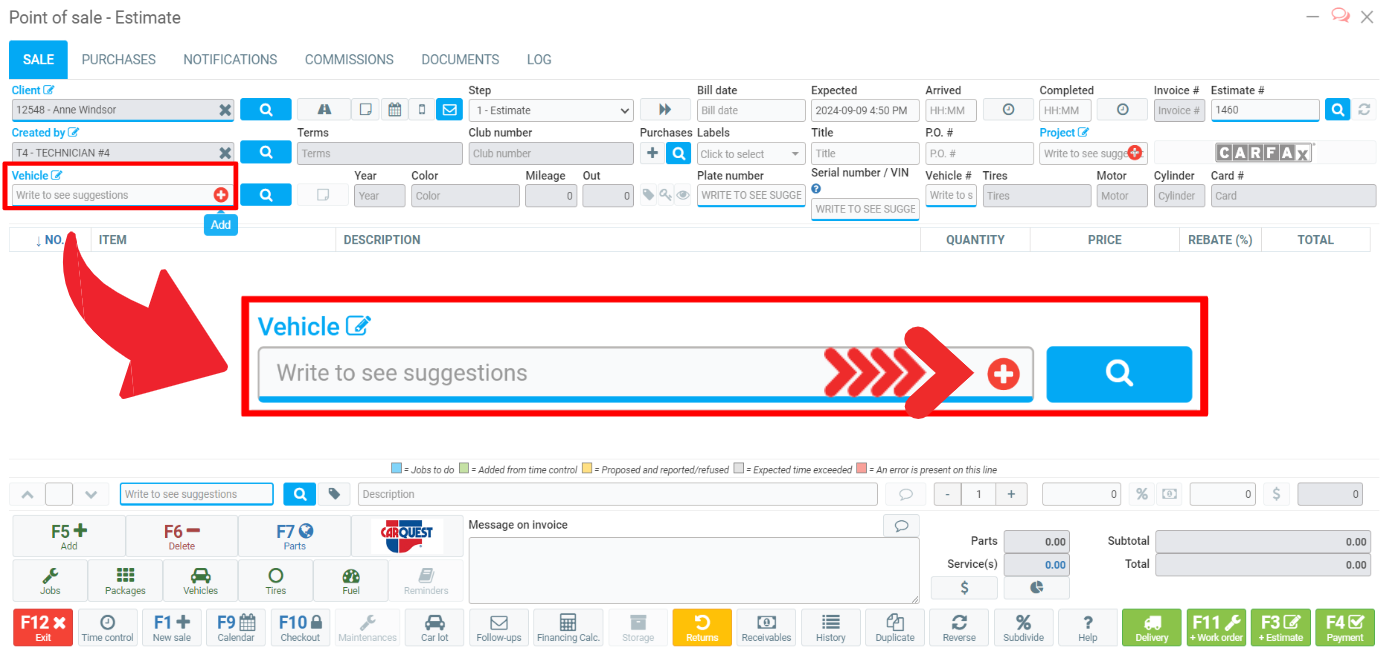Open the Point of Sale, enter the client and in the vehicle space, click on the red + symbol to add a vehicle.
