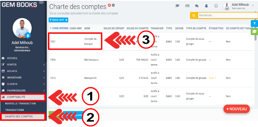 Pour effectuer cet ajustement de manière efficace et sans compromettre l'intégrité de vos documents comptables, cliquez sur Comptabilité > Charte de comptes.