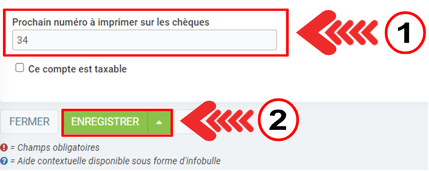 Après avoir sélectionné le compte, sous l'onglet Information, indiquez le Prochain numéro à imprimer sur les chèques.