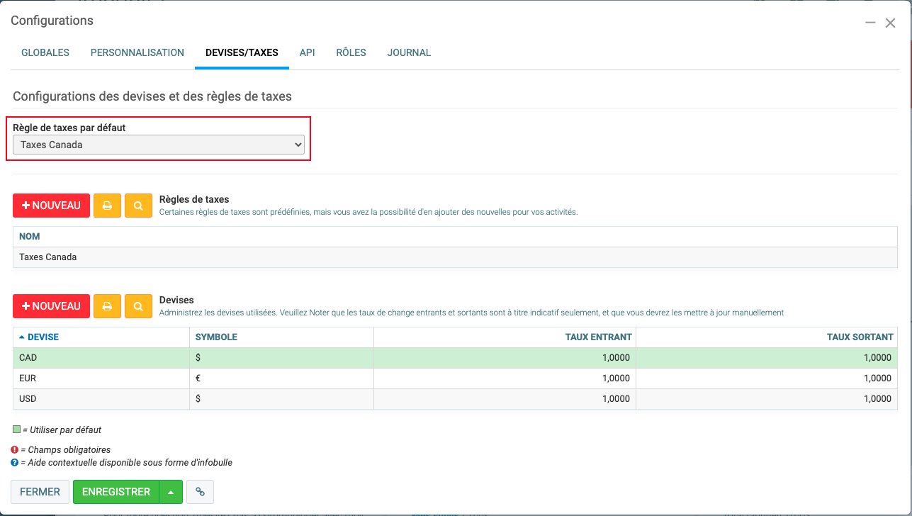 À la création de votre compte GEM-BOOKS, vous avez choisis si vous chargiez les taxes. Si pour une raison ou une autre vous ne vous les avez pas activé, rendez-vous dans les Paramêtres, Configurations et dans l'onglet Devises/Taxes. Spécifier la règle de taxe "Taxes Canada" dans le menu local intitulé "Règle de taxes par défaut".