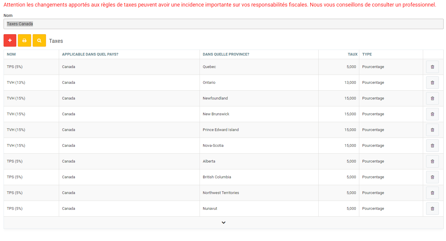 Dans cette section, toutes les taxes sont spécifiées par province. Vous pouvez donc cliquer sur chacune d'entre elles pour y insérer vos numéros de taxes. Il est important d'insérer vos numéros dans chaque province, car si vous facturez un client dans une province où le numéro de taxe n'y est pas inscrit, celui-ci n'apparaîtra pas sur la facture.