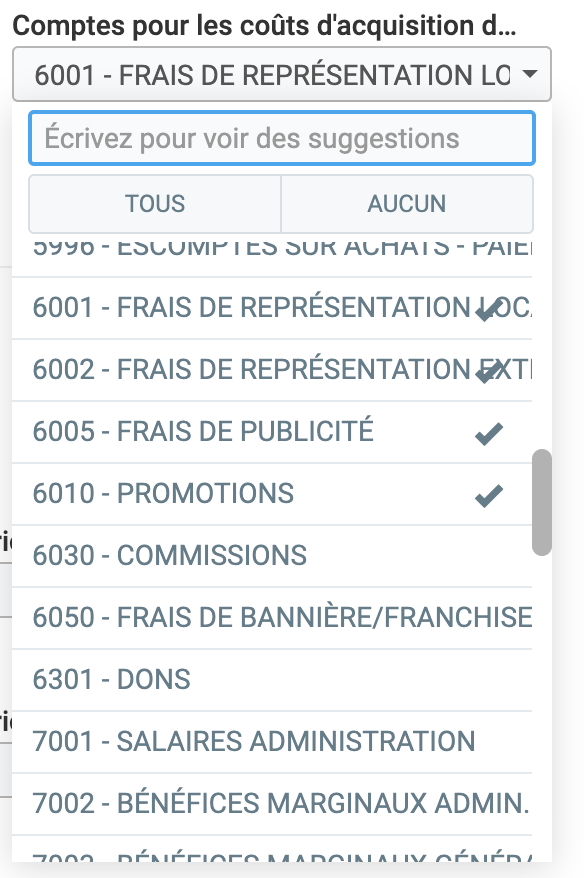 Note: Pour les comptes pour les coûts d’acquisition de clients, vous pouvez également sélectionner plusieurs GL. Les frais de ventes sont généralement dans les 6000.
