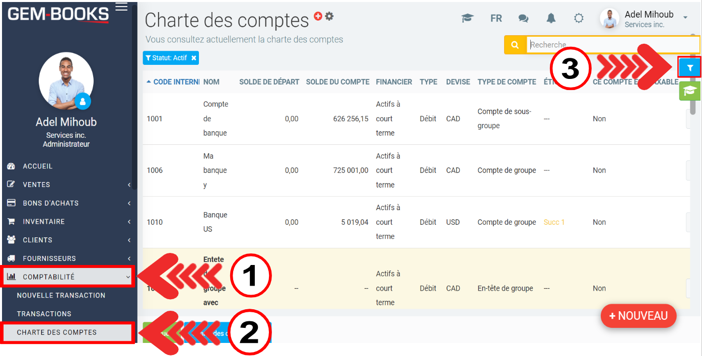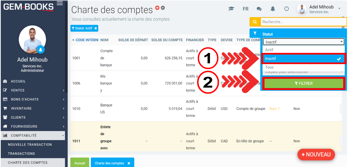 Pour activer un compte inactif, cliquez sur Comptabilité > Charte des comptes.