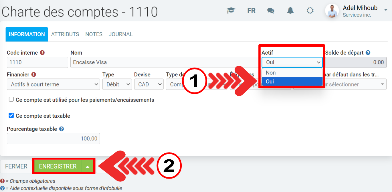 Nom - Inscrivez le nom du compte. Assurez vous que ce nom soit descriptif. Par exemple, s'il s'agit du compte pour les remises fédérales, nommez le « Remises fédérales ».