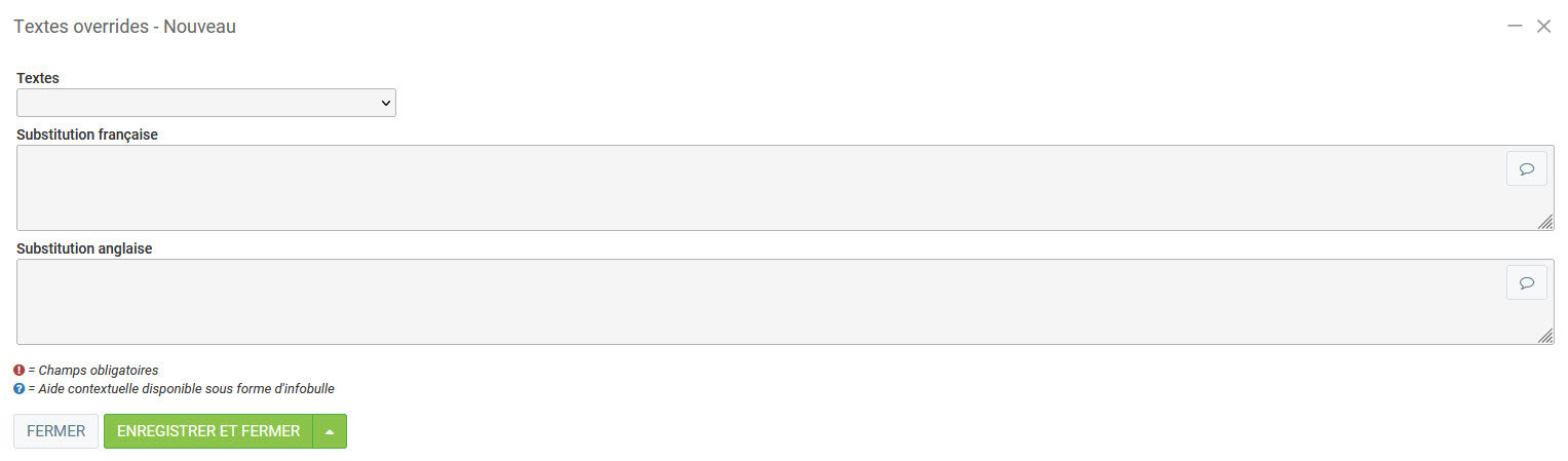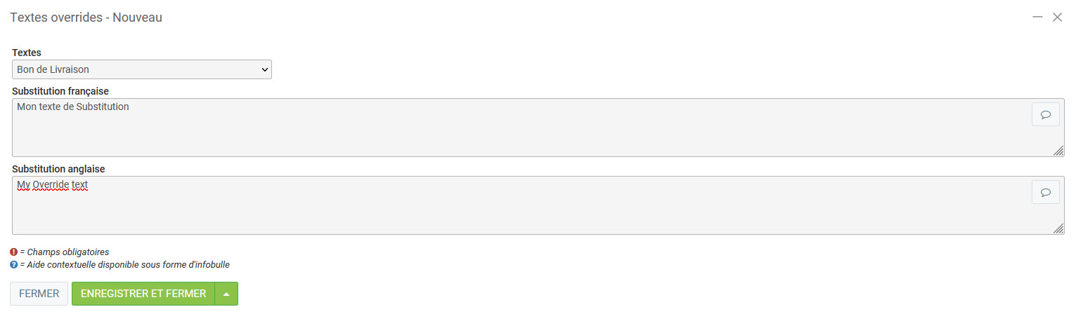 Sur le champ "Substitution française", nous allons mettre le texte qui remplacera le texte système en langue française.