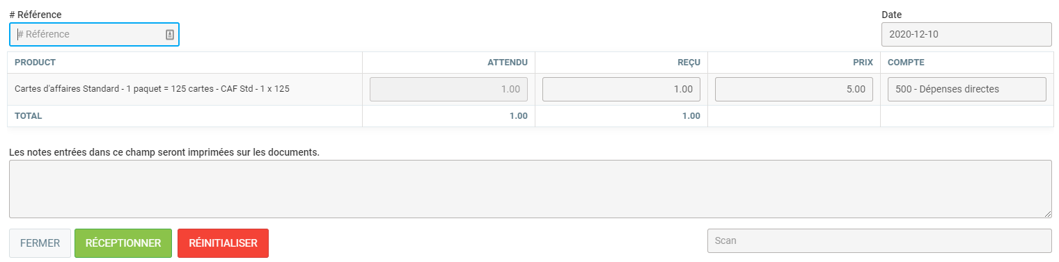 Par défaut, les champs "Reçu" sont pré-rempli avec la quantité attendu.