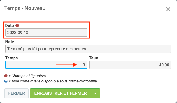 Au moment de déduire ses heures un peu plus tard, n'oubliez pas le symbole moins (-) pour le temps entré.