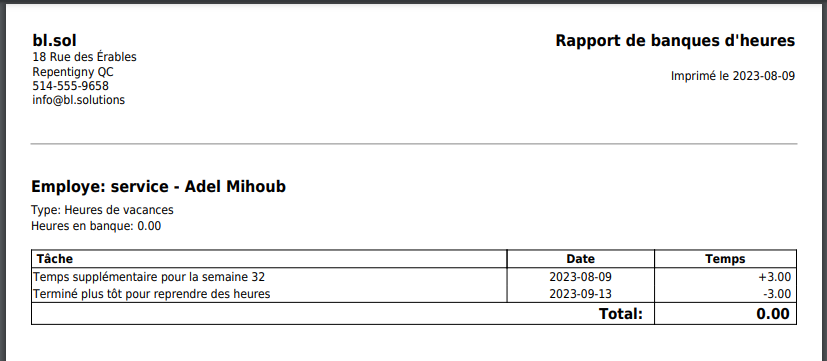 Vous pouvez en tout temps générer un Rapport de banques d'heures.