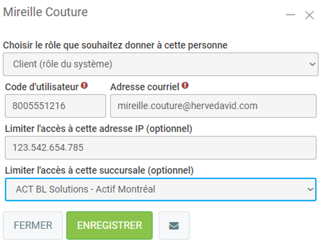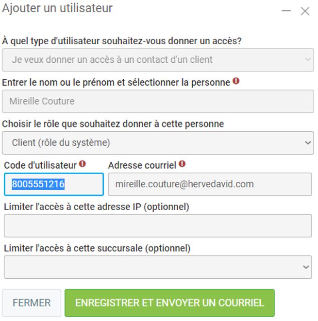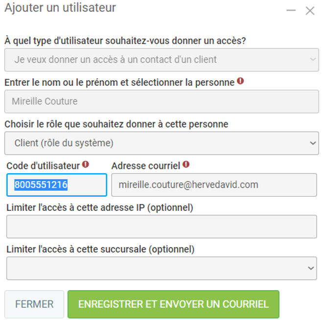 La fenêtre qui apparaît cette fois-ci vous permet de préciser l'accès, et d'envoyer un courriel au contact. Remplissez autant de champs que possible avec les données que vous avez.