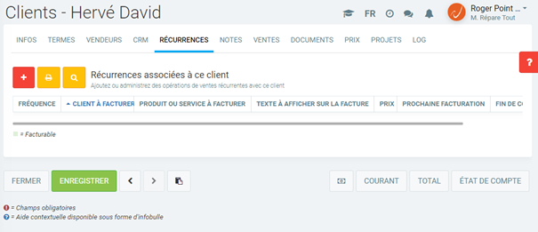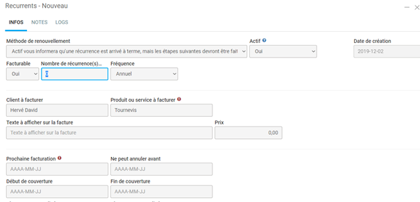 , qui vous permet de planifier les commandes de votre Client. Si, par exemple, il a l'habitude de commander un entretien de sa pelouse chaque fin du mois, GEM-BOOKS vous notifiera à chaque échéance. Le premier onglet INFOS renferme toutes les données d'une récurrence...