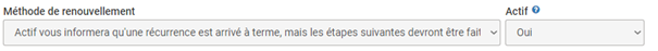 Le champ "Méthode de renouvellement" mentionne qu'une commande est à effectuer. Pour que GEM-BOOKS vous alerte au moment de la récurrence, il faudra cocher "Oui" dans le champ "Actif". Si vous cochez "Non", vous ne recevrez plus de notifications concernant cette récurrence, puisque. GEM-BOOKS va désormais la considérer comme non-renouvelable..