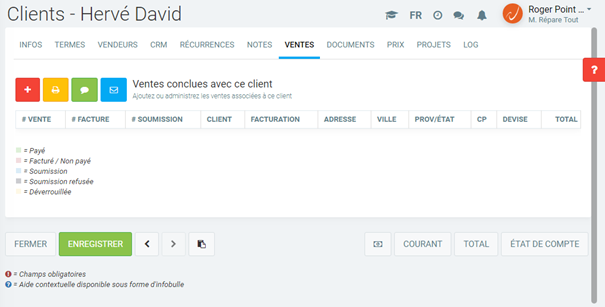 L'onglet VENTES vous présente l'historique des ventes déjà conclues avec ce Client, mais vous offre aussi la possibilité, à partir de ce point, de créer une nouvelle Vente.