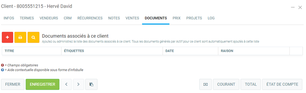 L’onglet DOCUMENTS vous présente l'historique des documents reliés aux ventes déjà conclues avec ce Client, mais vous offre aussi la possibilité, à partir de ce point, d’ajouter tous les fichiers qui concernent le Client : documents fiscaux, statuts, immatriculation, etc. Pour ajouter un nouvel élément à la liste il suffit de cliquer sur le symbole ![]()