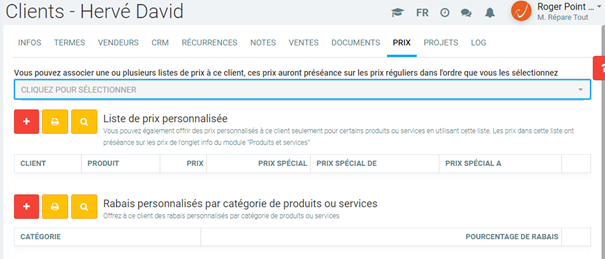 Dans l'onglet PRIX, vous avez la possibilité d'insérer des listes de prix. Vous pouvez y intégrer toutes les listes de vos produits et services, mais il serait plus intéressant de mettre des prix ciblés sur les intérêts du Client. Si vous avez accordé des remises, il vous est possible de les insérer dans la partie des "Rabais personnalisés".