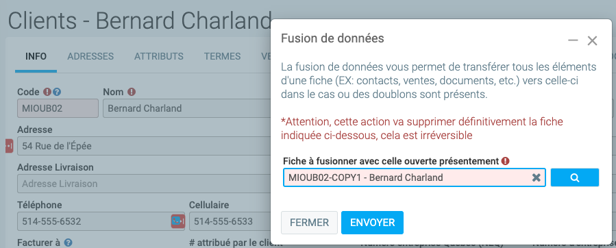 Cliquez sur le bouton Fusionner avec une autre fiche dans le bas à gauche. Dans notre exemple, le code du client principal est : MIOUB02