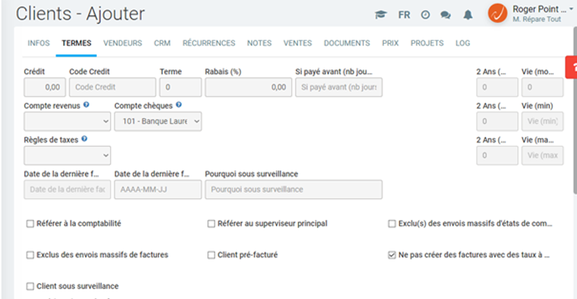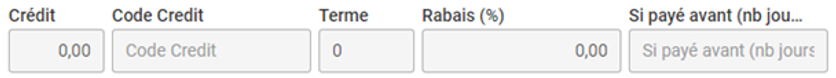 La première ligne de champs mentionne si le client possède un crédit qu’il a pour utiliser vos services ou consommer vos produits. Le "Code Crédit" est propre à vos activités. Vous pouvez également remplir le champ "Terme" pour définir pendant combien de temps le client peut utiliser ce crédit. Si vous avez accordé une réduction spéciale à ce client, insérez dans le champ "Rabais (%)", avec la condition de paiement avant une date que vous allez déterminer.