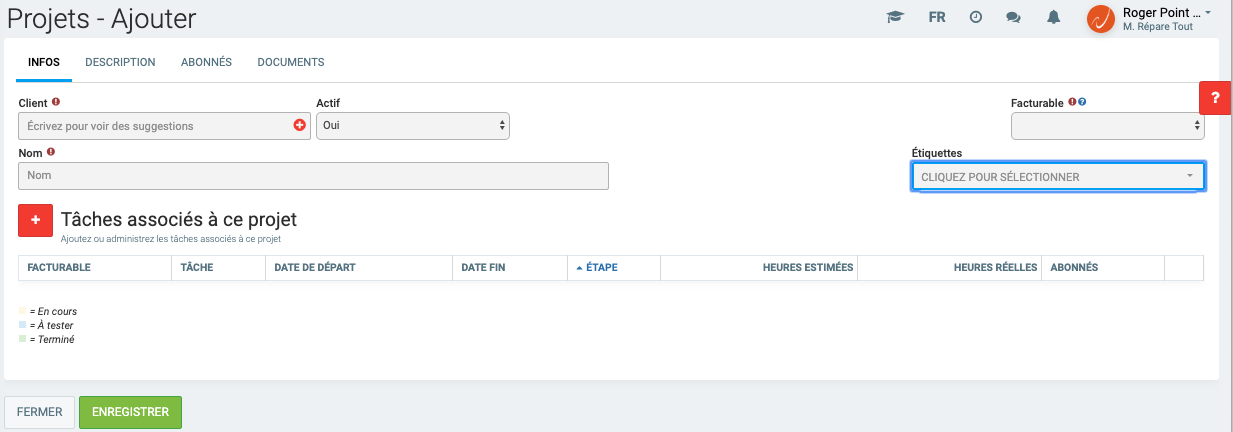 Les étiquettes créées ici seront applicables dans la fiche Projets, sous l'onglet INFOS.