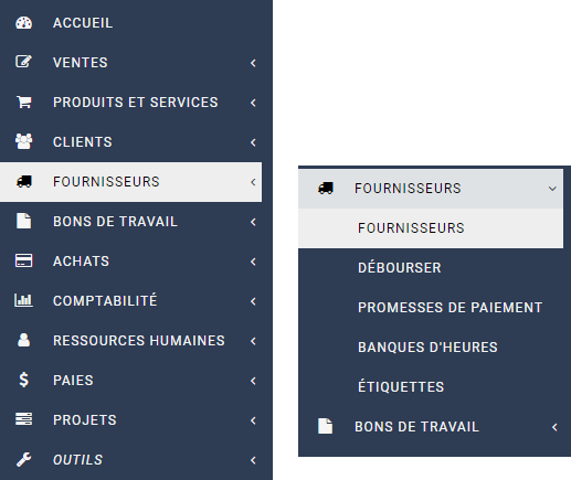 Le menu FOURNISSEURS vient juste après CLIENTS dans le menu principal.