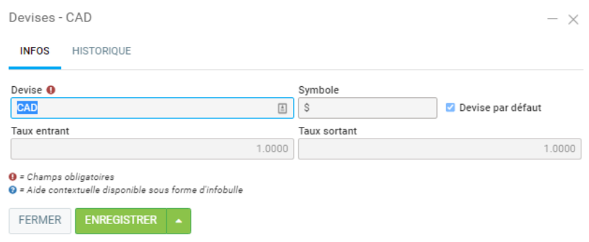 Vous remarquez que Devise est un lien. En cliquant dessus, vous obtenez une fenêtre qui demande d’écrire le Taux entrant et le Taux sortant de la devise utilisée (ce qui correspond au taux de conversion), ainsi que du symbole à utiliser ...
