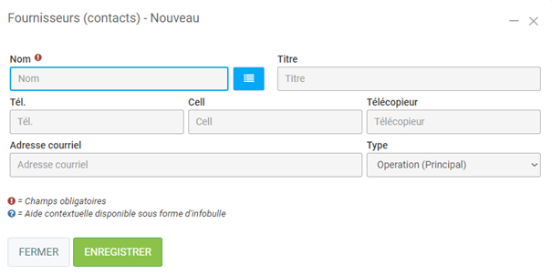 , qui se trouve juste après le grand titre Fournisseurs, ou bien en bas de page, à droite. Vous verrez alors apparaître une fenêtre qui demande les coordonnées du Fournisseur, à travers l’onglet INFOS ...