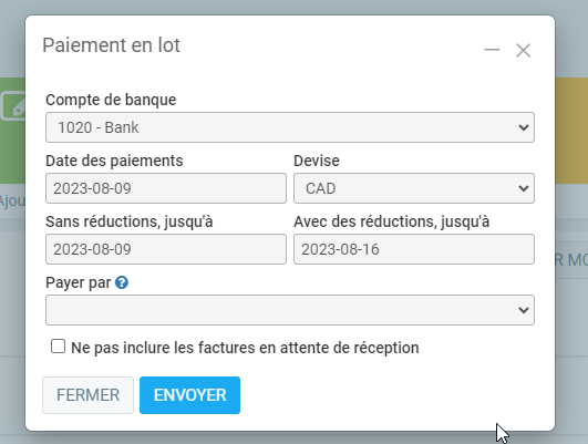 Les paiements en lot servent à effectuer plusieurs paiements à vos fournisseurs, selon certains paramètres, par exemple, si certains de vos factures à payer sont en retard. Le menu se trouve sous Comptabilité.